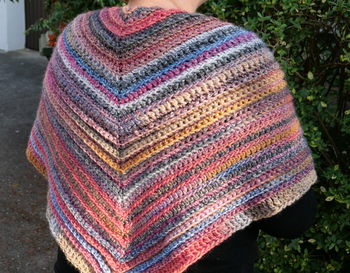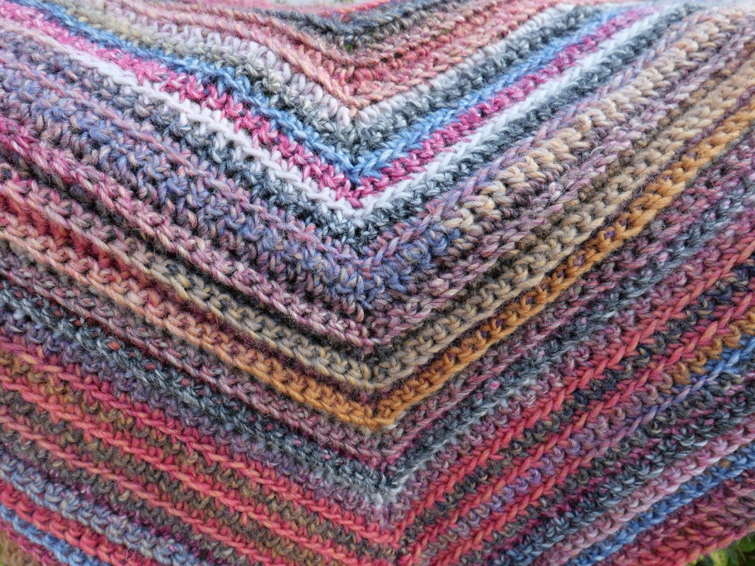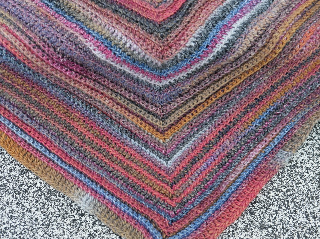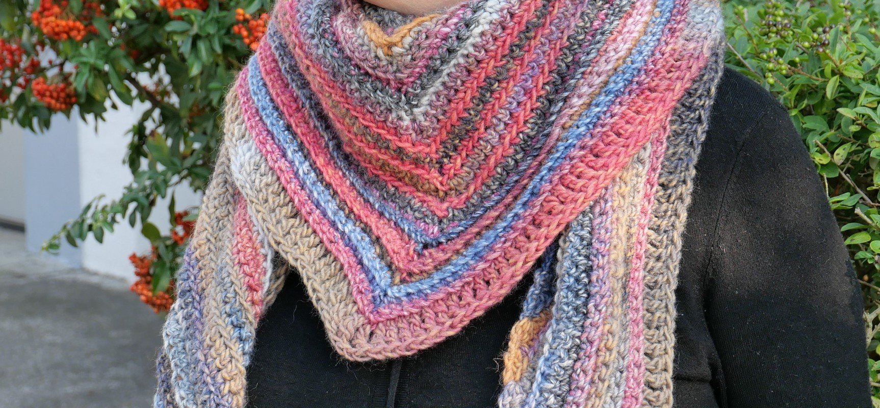 Das in die Breite gehende Dreieckstuch Melitta ist das ideale Anfängertuch. Das einfache Muster läßt die wunderschöne Färbung und Struktur der Wolle besonders gut zur Geltung kommen.
