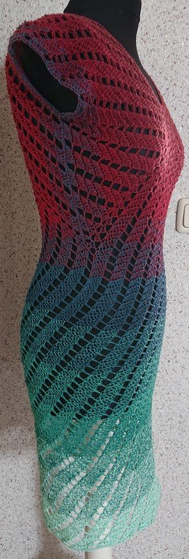 Für das Kleid habe ich für Konfektionsgröße 36 1000m LL eines 3fädigen Farbverlaufgarns benötigt. Pro Konfektionsgröße größer oder kleiner benötigt ihr ca. 150m mehr oder weniger Garn.