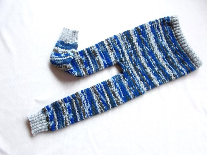 150 g Wolle in der Hauptfarbe blau – hier Sockenwolle - Lauflänge 150 m/50 g (würde auch für die vollständige Leggings ohne Streifen reichen)