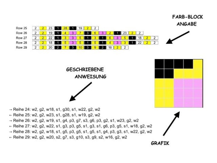-geschriebene Instruktionen - Reihe für Reihe (für feste Maschen)