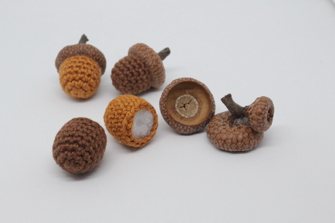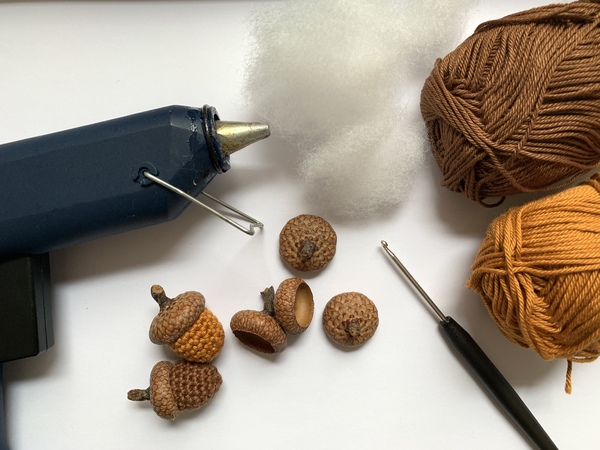 Eichelkappen beim Spazierengehen sammeln, das Untertei schnell häkeln, an die Kappe kleben - fertig!
