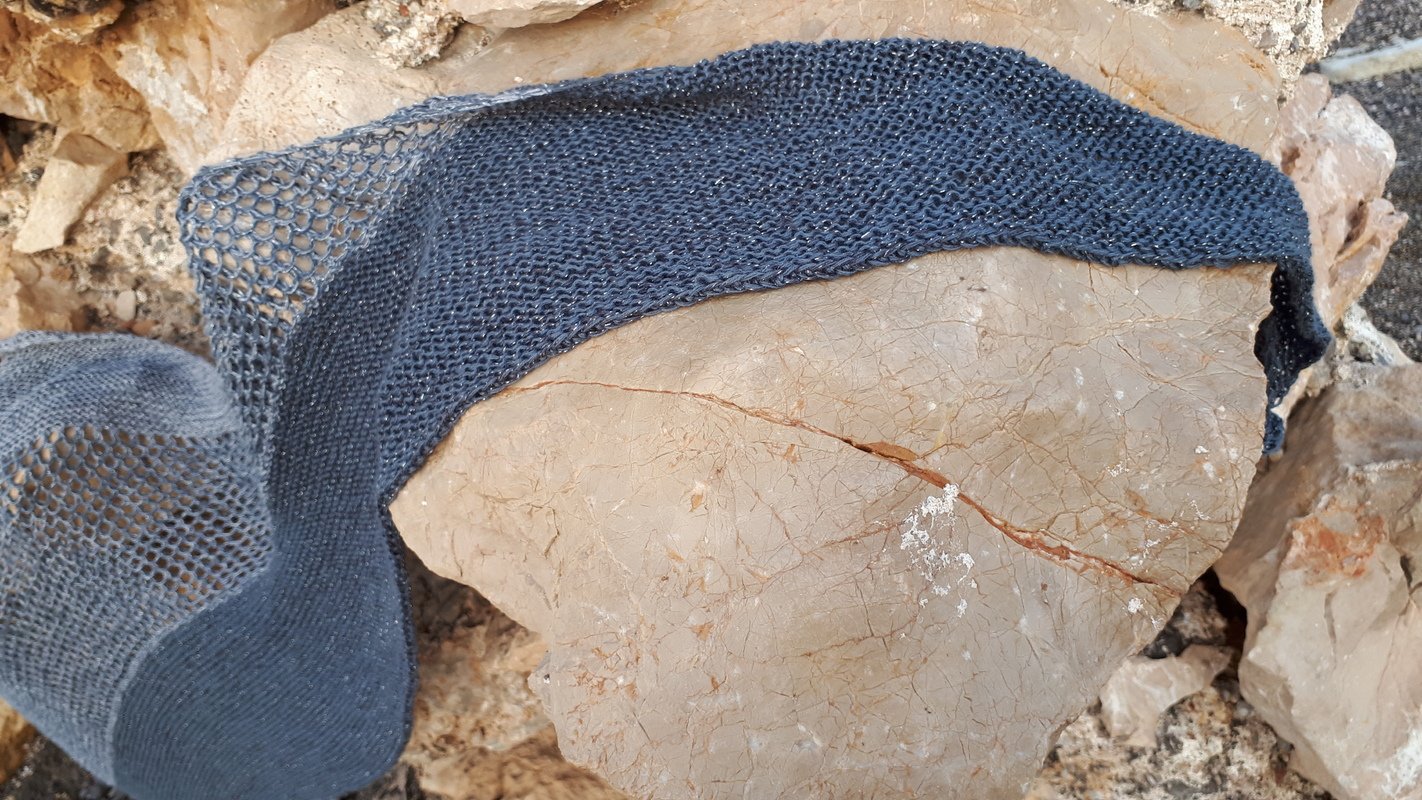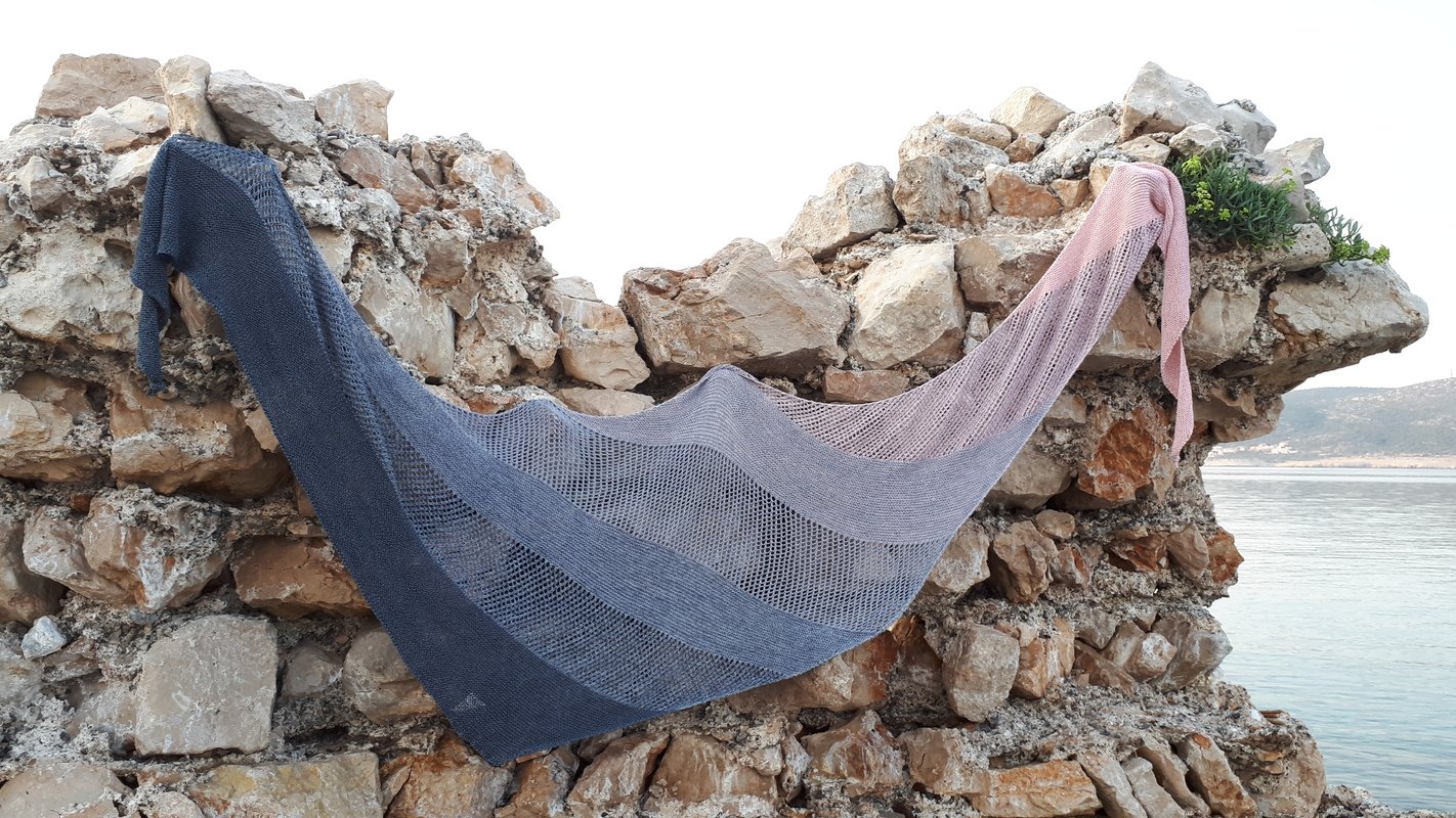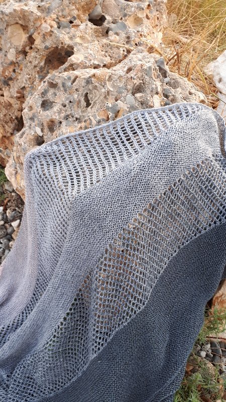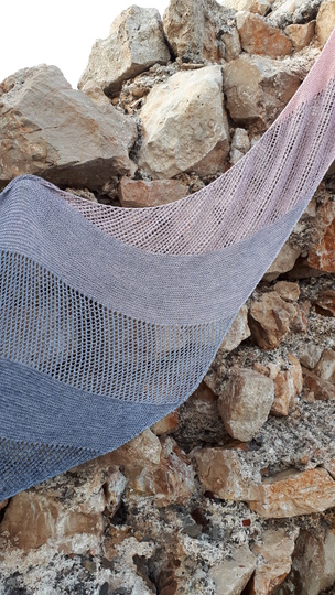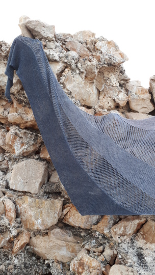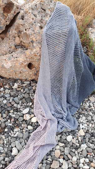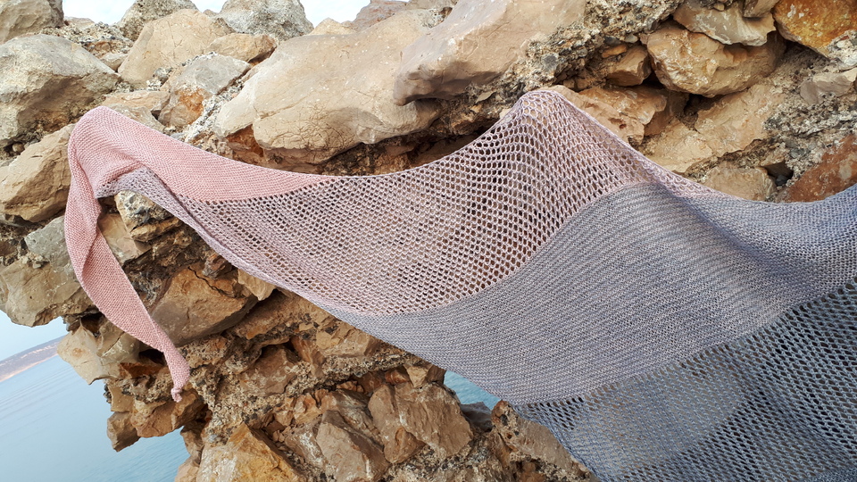 Ein asymmetrisches Dreieckstuch, das beidseitug Tragbar ist. Es hat Krausrechte- und Lochmusterpassagen. Man arbeitet in Hin- und Rückreihen.