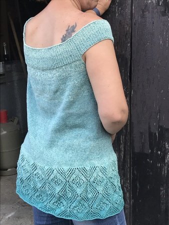 Ein Sommertop mit Carmenkragen, ohne Naht in Größe 42. Die Idee kam als ich von meiner Freundin (einer leidenschaftlichen Häklerin) einen handgewickelten Bobbel zum Geburtstag bekam. Wir haben gleich überlegt was es werden könnte. Der dezente Farbverlauf sollte schön zur Geltung kommen und es sollte luftig sein, denn es war an diesem Tag sehr heiß. Außerdem ist schulterfrei ja im Moment so angesagt. Und das ist bei unserer Diskussion herausgekommen.