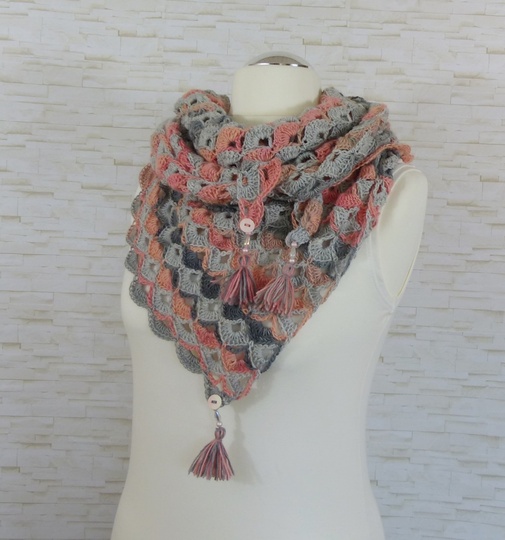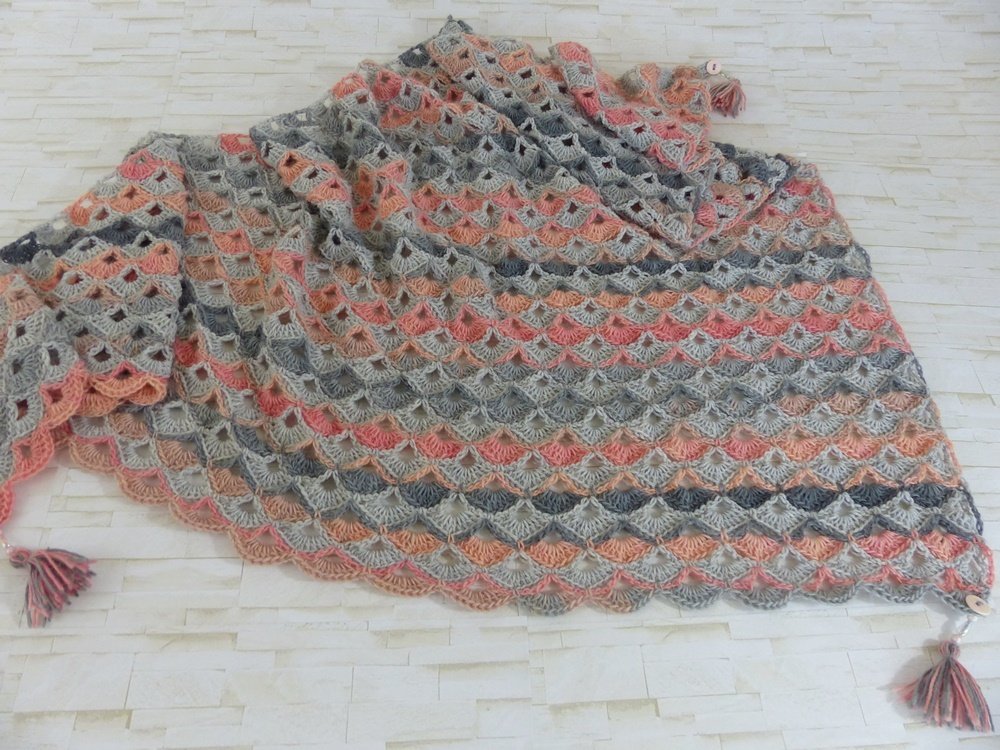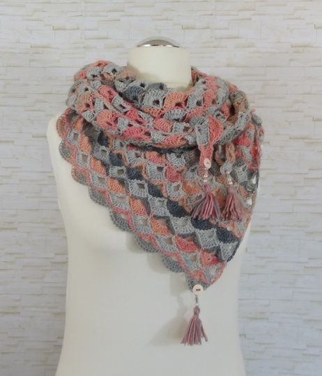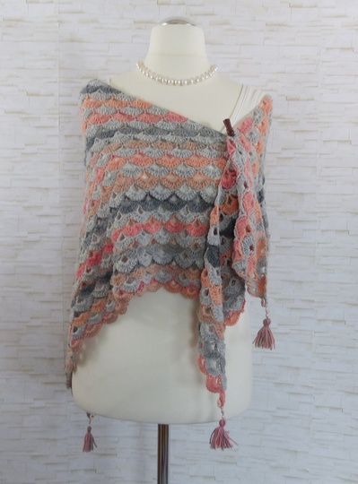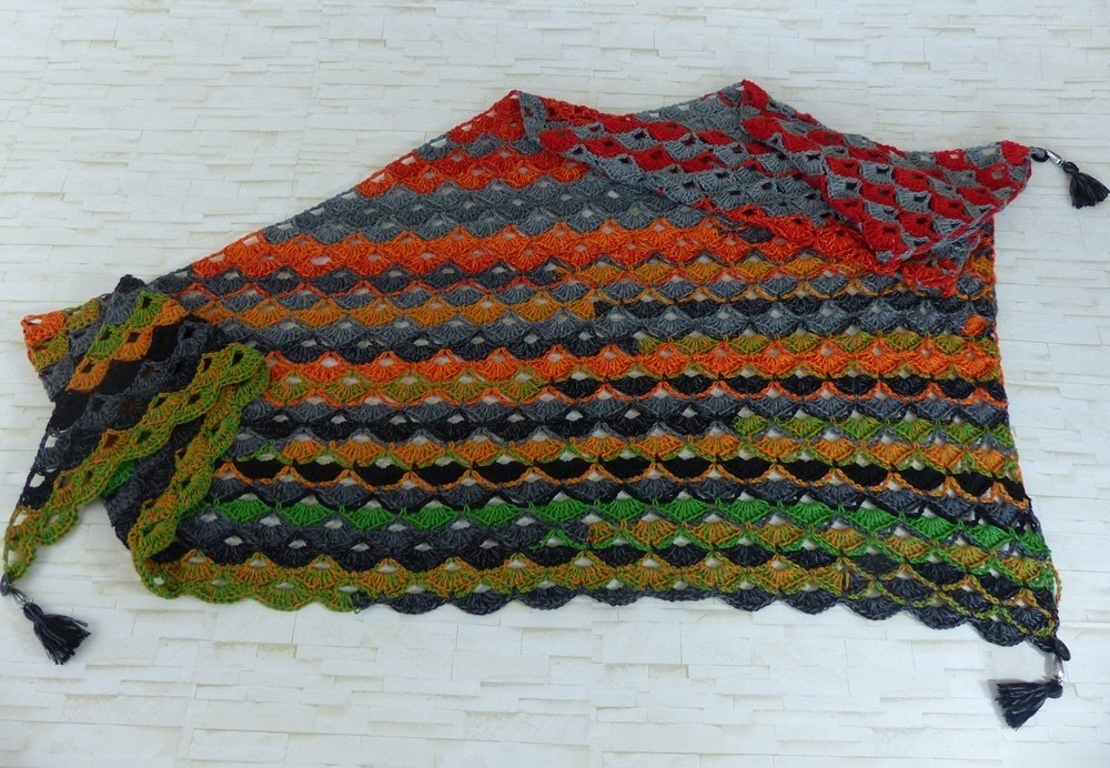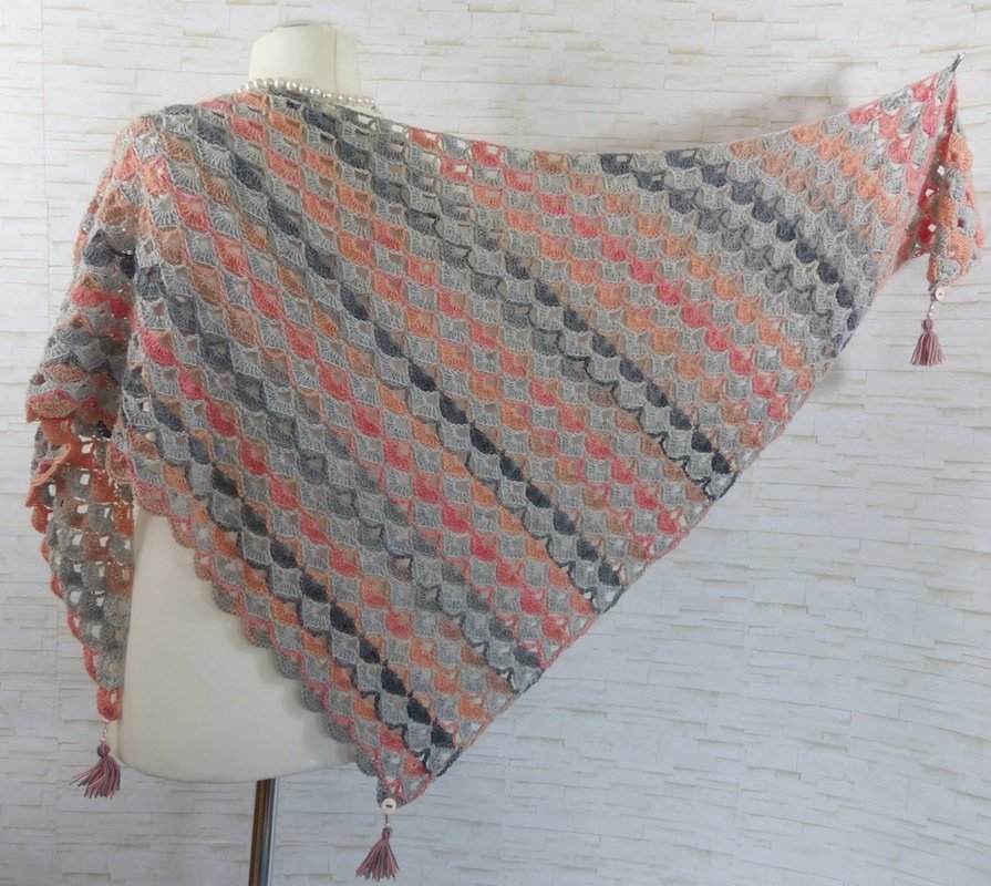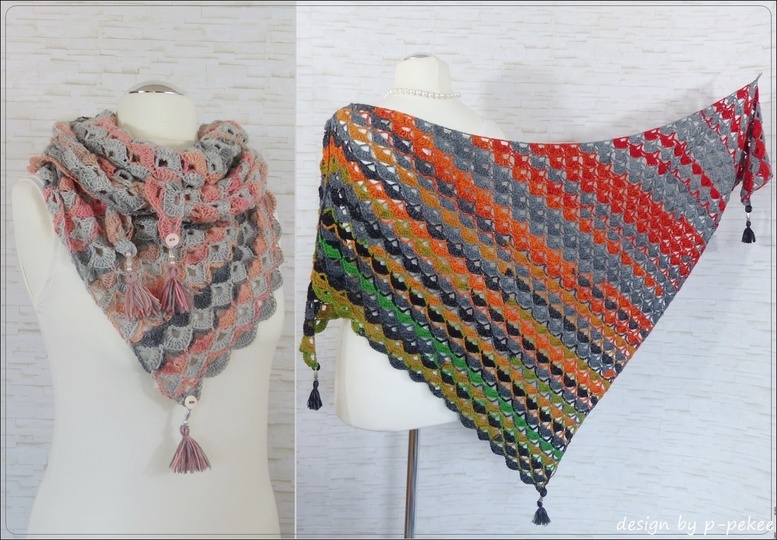 "Tamina" ist ein zweifarbiges Häkeltuch mit Muschelmuster. Das Tuch wird von der Seite her gehäkelt und ist leicht assymetrisch. Der Mustersatz wiederholt sich, somit kann die Größe des Tuches selbst bestimmt werden.