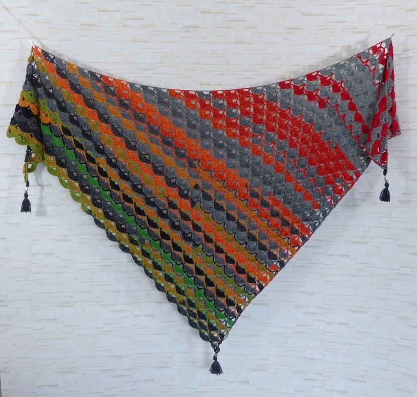 Das Tuch wird mit zwei unterschiedlichen Knäuel (Bobbel) gehäkelt. Der Faden wird jedoch nicht abgeschnitten, sondern am Rand dekorativ verhäkelt. Somit ergibt dies gleichzeitig einen schönen Abschluss. Mit toller Farbverlaufswolle ein optisches Higlight.