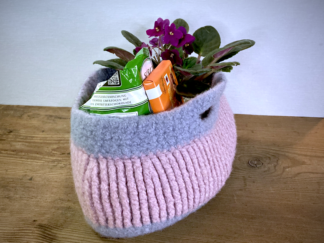 Dieses praktische, ovale Filzkörbchen ist mit einer dicken Nadelstärke schnell gehäkelt.