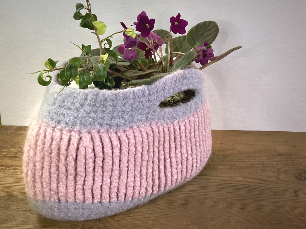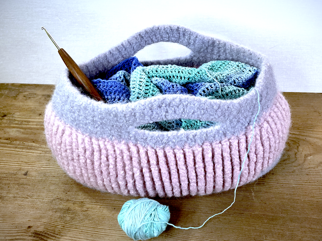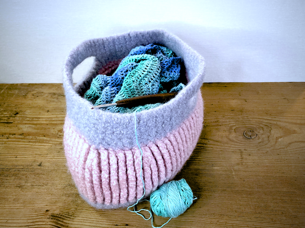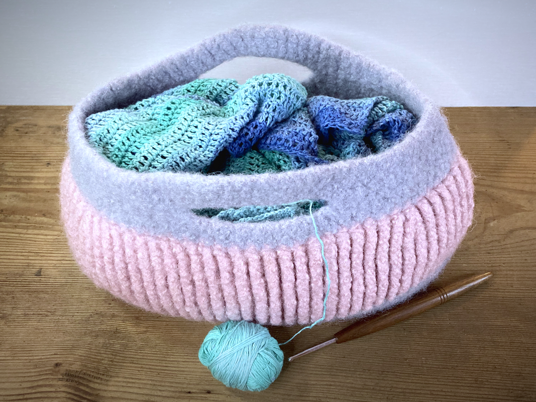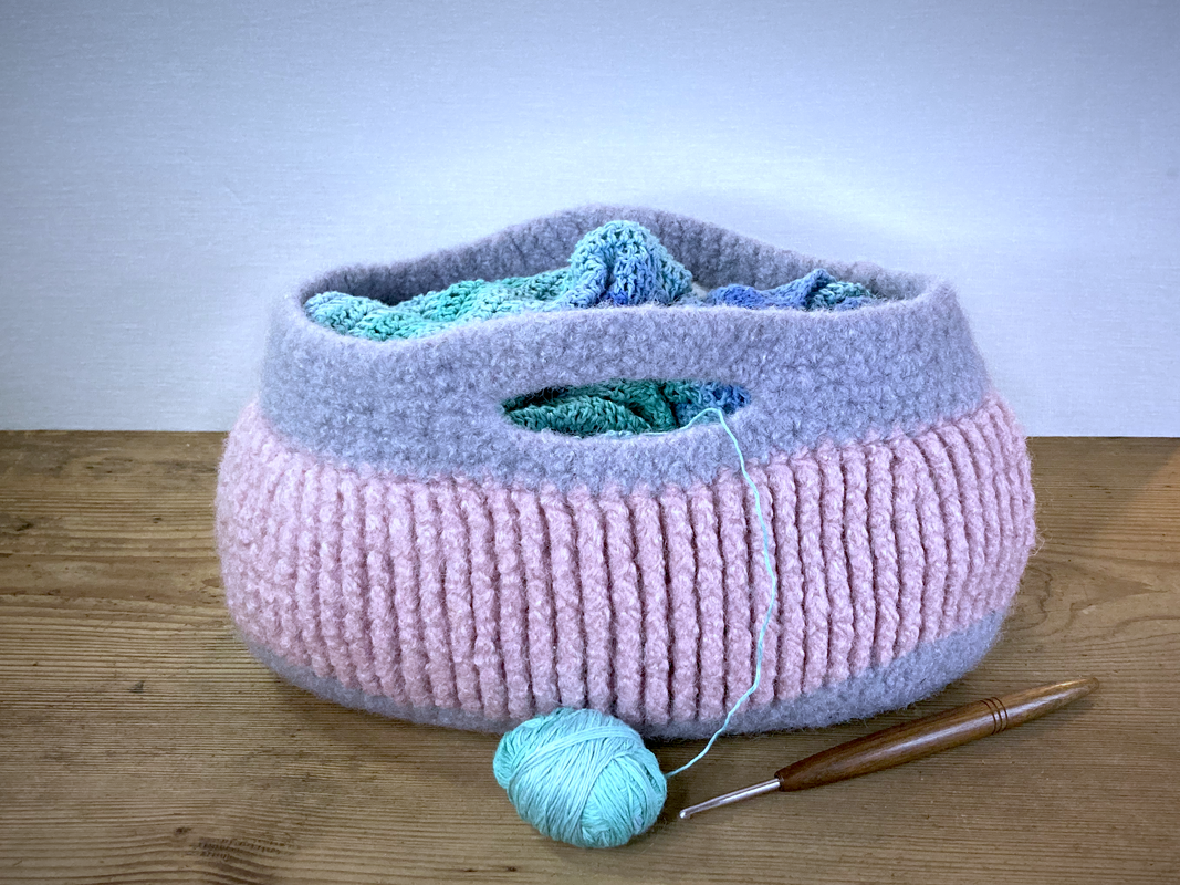 Gehäkelt mit Nadelstärke 12 wird der Korb nach dem filzen in der Waschmaschine ca. 29 cm breit, 15 cm hoch und 15 cm tief
