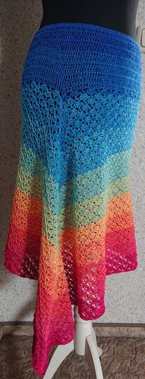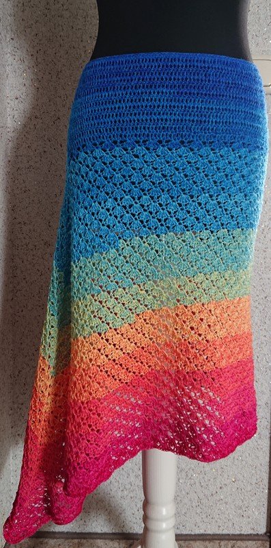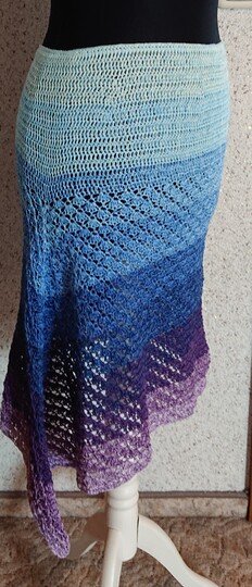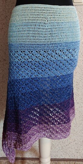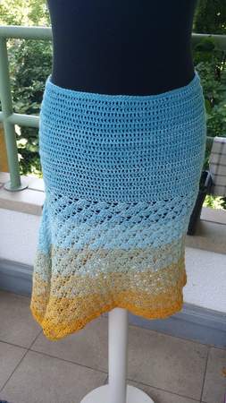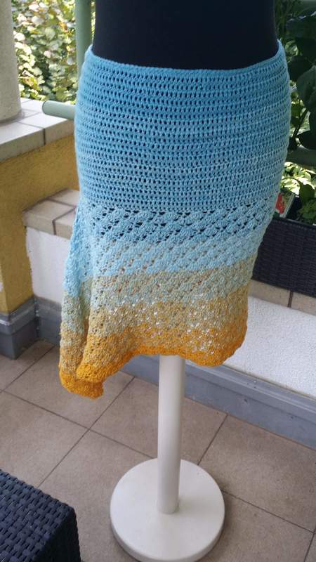 Für den Rock habe ich für Konfektionsgröße 36 1000m LL eines 3fädigen Farbverlaufgarns benötigt.
