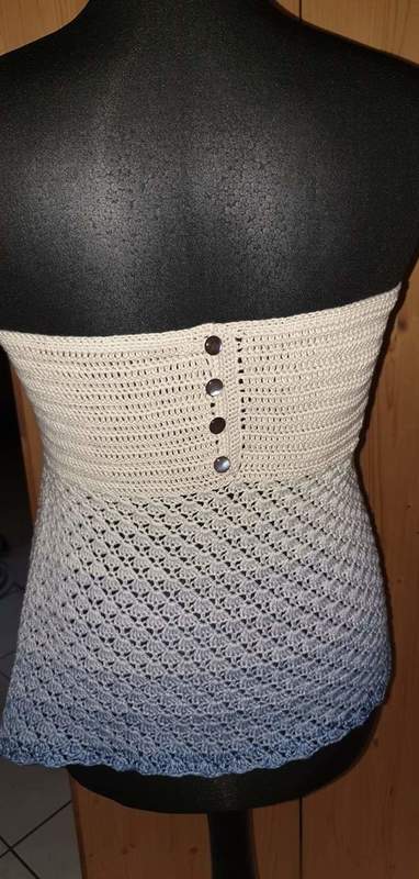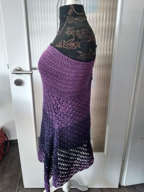 Für das Top habe ich für Konfektionsgröße 38 1200m LL eines 3fädigen Farbverlaufgarns benötigt.