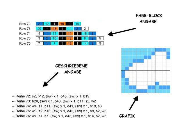 -farbige Zahlen-Blöcke für jede Reihe für feste Maschen (Stb od. hStb)