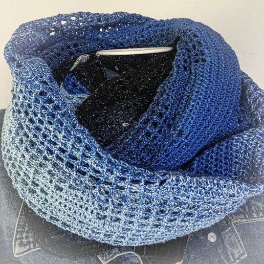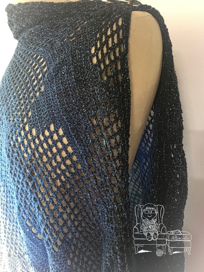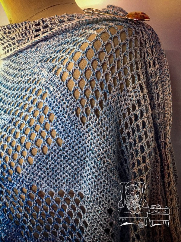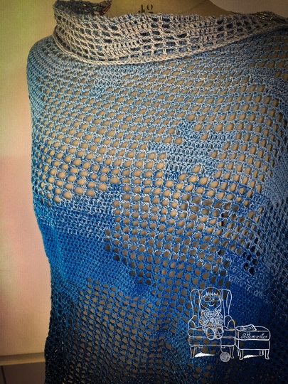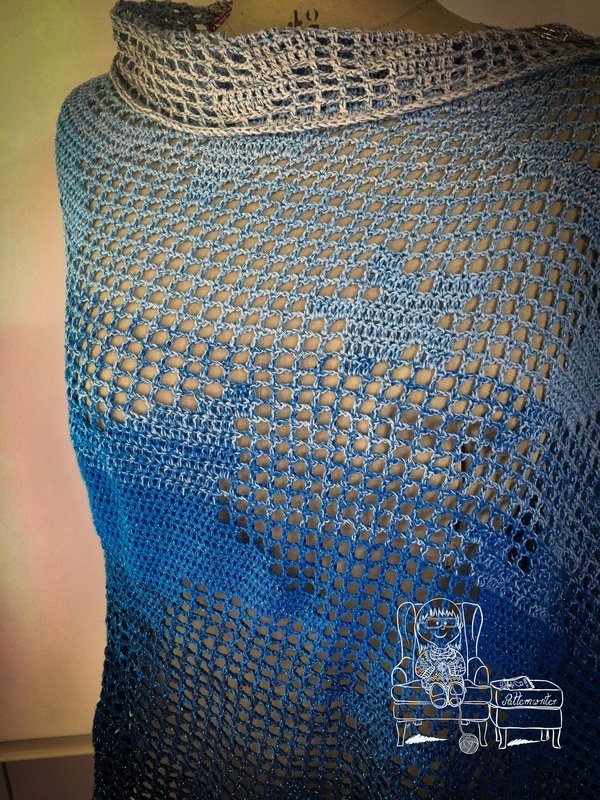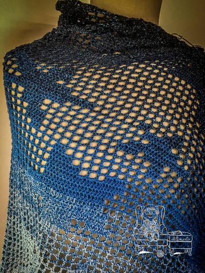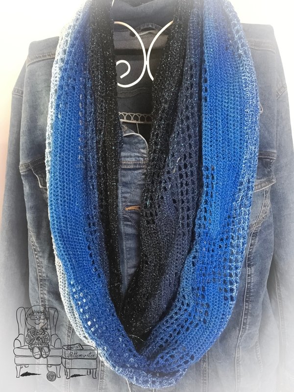 Der gehäkelte Loop «Sky with Stars» ist in der Filethäkel-Technik gearbeitet. Er lässt sich sehr variabel tragen. Entweder locker um den Hals, mit einer Tuchnadel drapiert oder doppelt um den Hals. Die Varianten kannst du in meinem Vorschaubildern sehen.