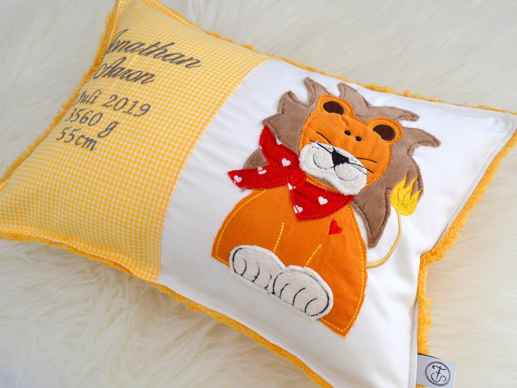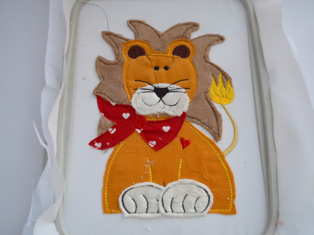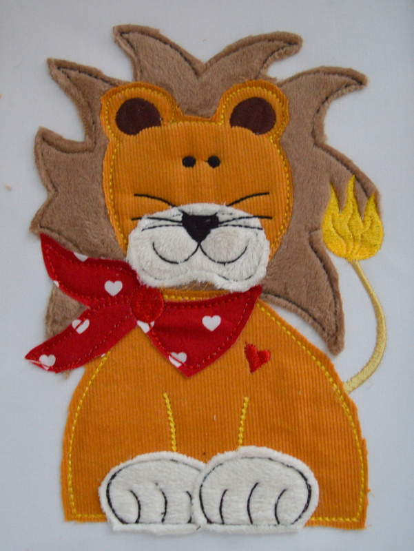 Durch Unterlegen des Löwen mit Stoff während des Stickvorganges erhaltet ihr einen süßen Löwen in Doodle-Optik (Fransen-Look), einfach überstehenden Stoff während des Stickvorganges abschneiden. Die Maschine hält nach jeder Farbe/Durchgang, so kann der Rahmen aus der Stickmaschine genommen werden, um den überstehenden Stoff abzuschneiden und neuen Stoff aufzulegen.