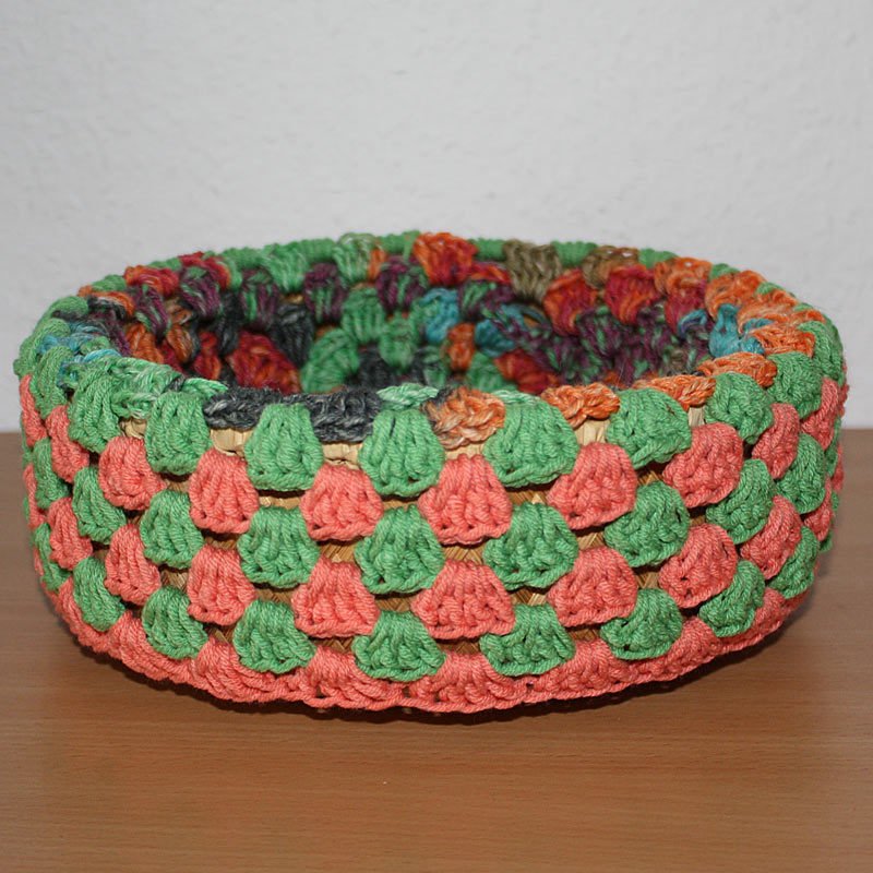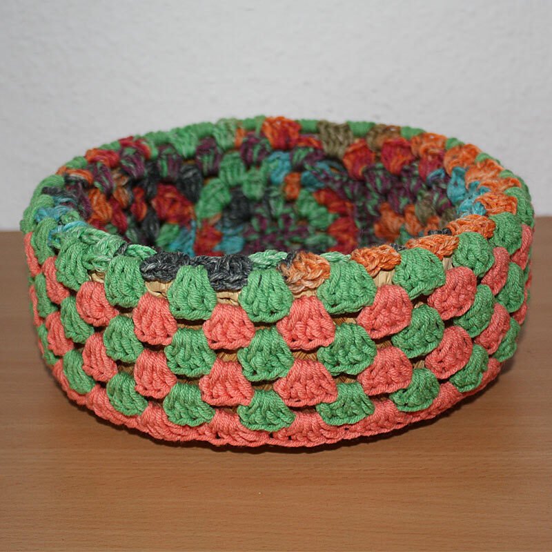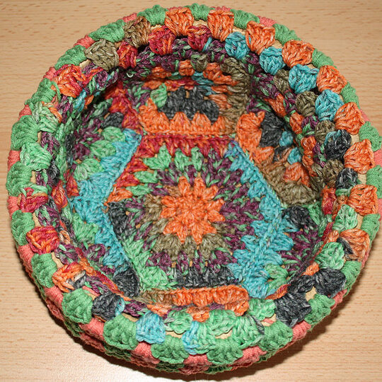 Farbenfroher Korb aus einzelnen Grannys gehäkelt.