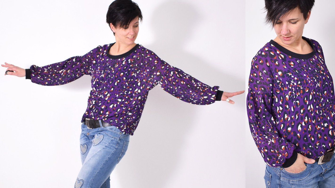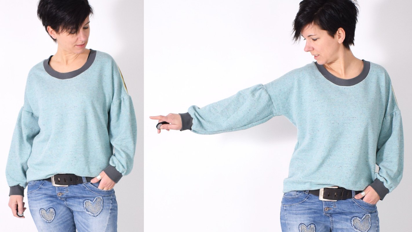 Die überschnittenen Schultern mit angesetztem Puffärmel sind dabei ein niedliches Detail. Der Saum des Shirts kann mit oder Bündchen gearbeitet werden.