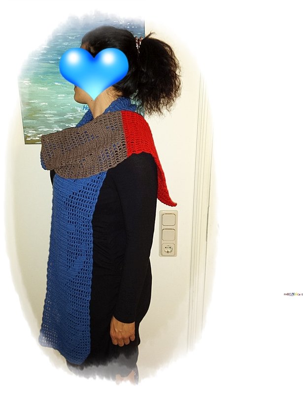 210 Acrylgarn, davon 150 gr in Blau, 30 gr in Graubraun, 30gr in Rot.