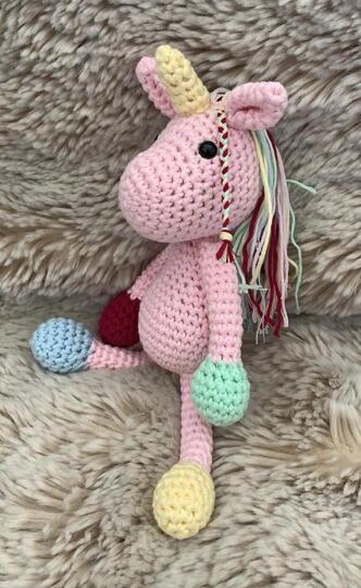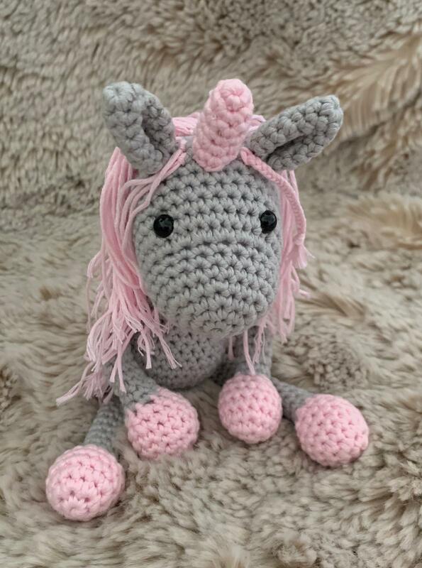 Das Einhorn wird mit der angegebenen Wolle ca 25cm groß