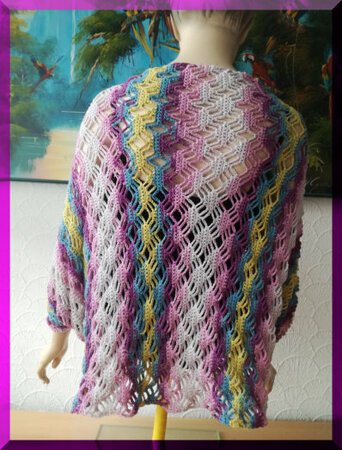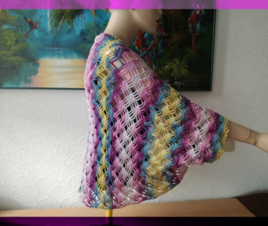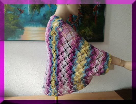 Die Anleitung umfasst 4 Seiten, darin sind ein Modellfoto, Materialliste, schriftliche Häkelanleitung, eine Häkelschrift sowie Erklärungen zur Häkelschrift enthalten. Der Ärmelschal wird in Reihen gehäkelt