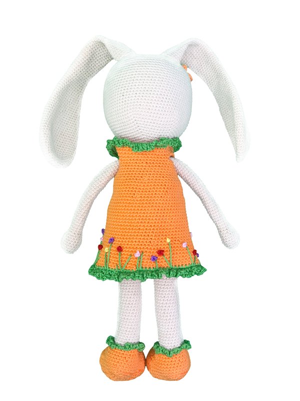 Mit dem angegebenen Garn und der Nadelstärke 3,0mm wird das kleine Kuschelschnuffelbande Hasenmädchen „Möhrchen“ insgesamt ca.36cm groß.