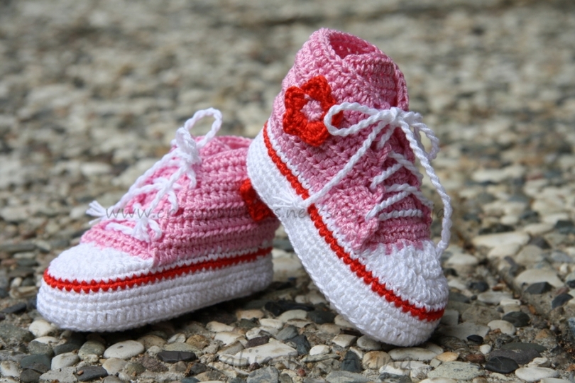 Diese Mädchen-Baby-Chucks mit Deko-Blume eignen sich für alle, die Luftmaschen, feste Maschen, Kettmaschen und (halbe) Stäbchen häkeln können.