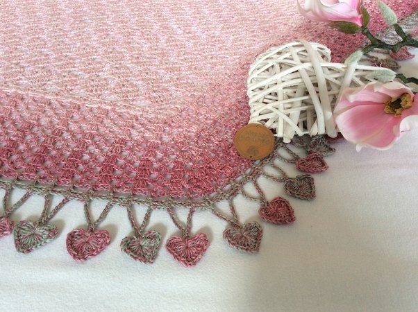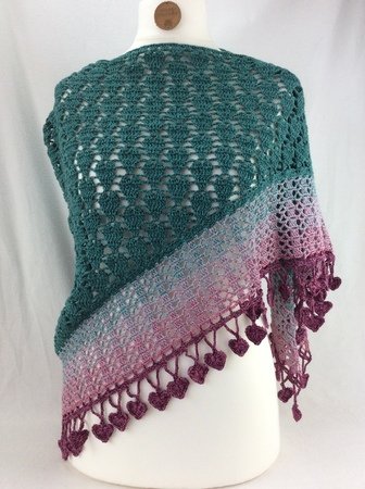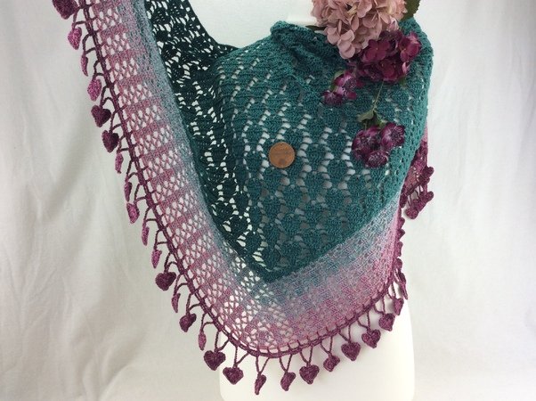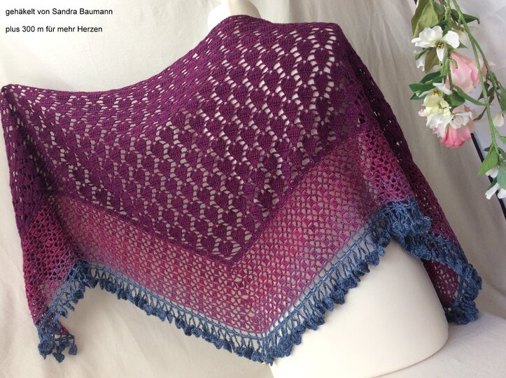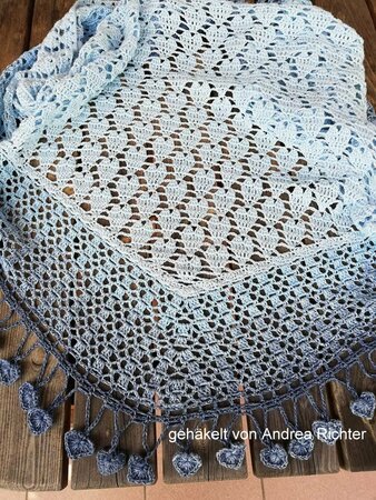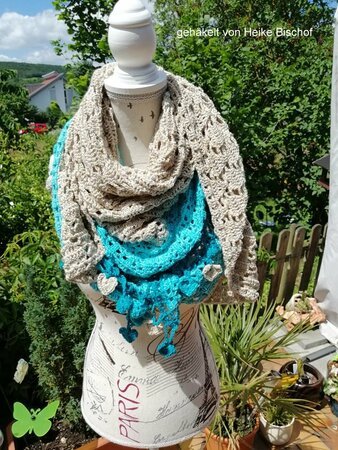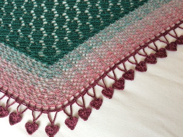 Das Tuch hat bei mir ca. eine Spannweite von 212 cm und eine Länge von 70 cm (ohne die Herzen am Rand).