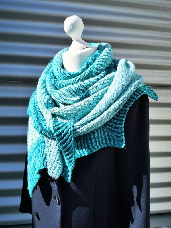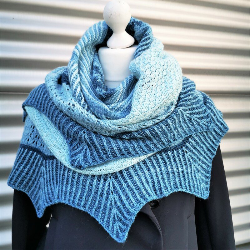 Es ist abwechslungsreich, denn Du strickst nicht nur Muster mit linken und rechten Maschen, sondern auch Hebemaschen und zweifarbiges Patent (Brioche). Durch die verschiedenen Muster ist dieses Tuch eher für Strickerinnen mit einiger Erfahrung geeignet.