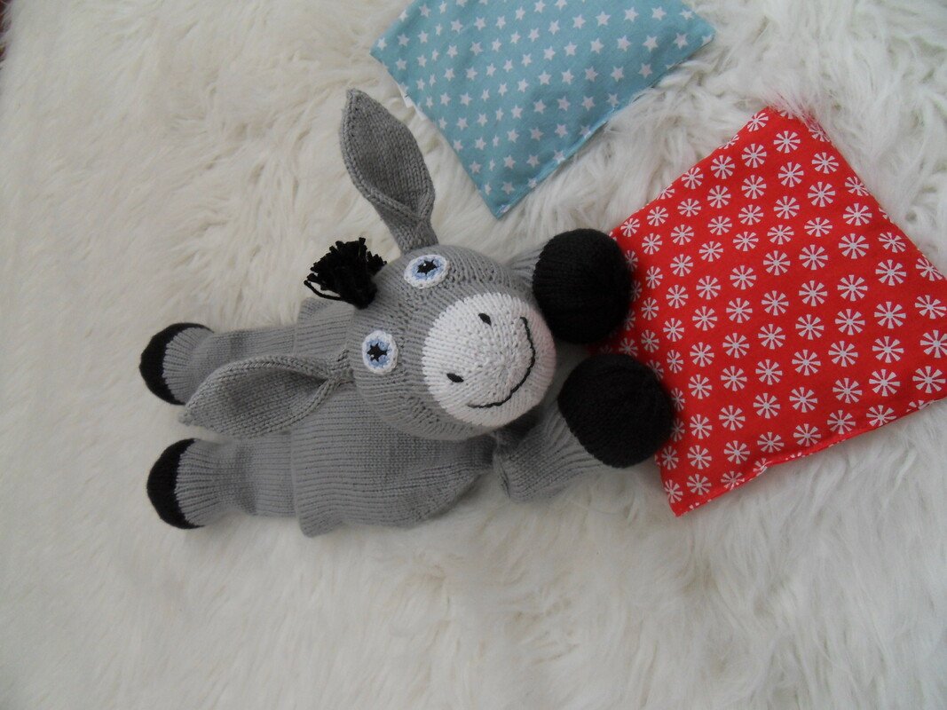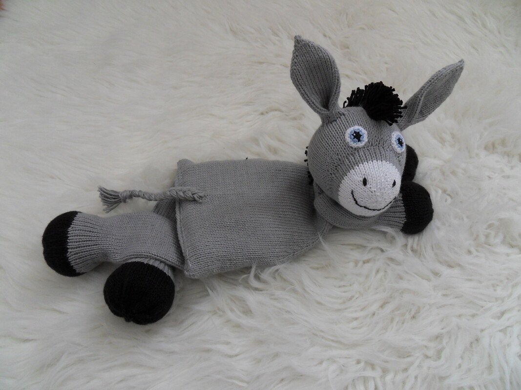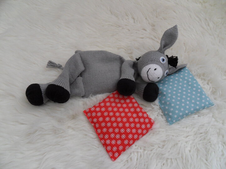 Diese süße Eselchen ist ein etwas anderes Schmusetuch, er ist so richtig zum liebhaben. Er liebt es zu schmusen, zu kuscheln und zu trösten, wenn es mal nötig ist. In seinem Bauch kann ein Traubenkern- oder ein Kräuterkissen zum Einsatz kommen. Einfach den Reißverschluss öffnen und schon heilt das Eselchen. Er ist sehr weich und pflegeleicht. Er ist aus einem Baumwollgarn gearbeitet. Er lässt sich mit 40°C im Wollwaschprogramm waschen. Er ist ca. 35 cm groß.