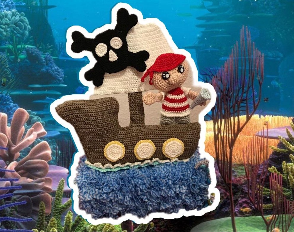 Die Anleitung erklärt Schritt für Schritt wie das Piratenschiff mit Untergrund gehäkelt werden kann. Die Anleitung besteht aus 17 Seiten und zahlreichen Detailbildern.