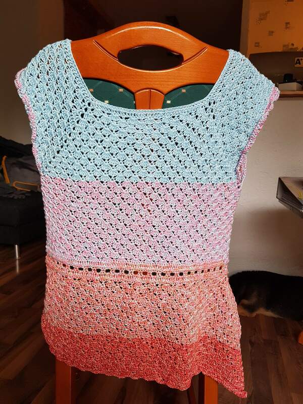 Die Tunika Betti ist eine leicht asymmetrische Tunika. Die Tunika wird an einem Stück in Runden gehäkelt. Dadurch ist sie hervorragend für Farbverlaufsgarn geeignet.