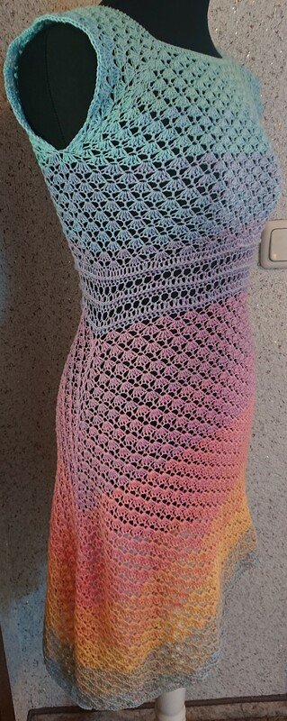 Ich habe für Konfektionsgröße 36 1200m Lauflänge eines 3fädigen Farbverlaufgarns benötigt.