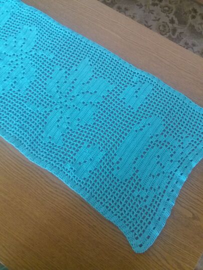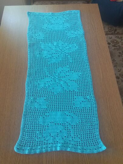 Der Tischläufer hat das Maß von ca.LxB 90 cm x 38 cm, dafür habe ich 2 + 3/4 Knäul a` 180m / 50g benötigt.