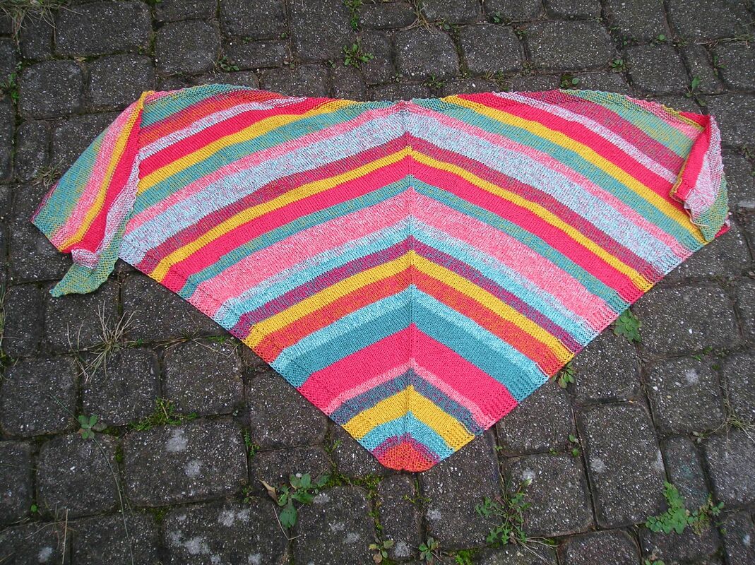 Das Tuch eignet sich besonders gut zur Resteverwertung. Es wurde aus 5-fädigen Resten von LoLa-Farbverlaufsbobbeln (50 % Baumwolle, 50 % Acryl) von der Garnmanufaktur gestrickt. Es lässt sich leicht in der Größe variieren und kann genau so gut mit einer anderen Garnstärke gestrickt werden (z.B. aus 4-fädigem Garn). Man beginnt unten in der Mitte mit dem kraus rechts gestrickten Rand. An den Rändern und in der Mitte nimmt man Maschen zu, damit das Tuch in die Breite wachsen kann. Ansonten werden einfach mit den Garnresten Streifen in glatt rechts gestrickt. Das ist nicht besonders schwierig und kann auch von Strickanfängerinnen gut bewältigt werden.