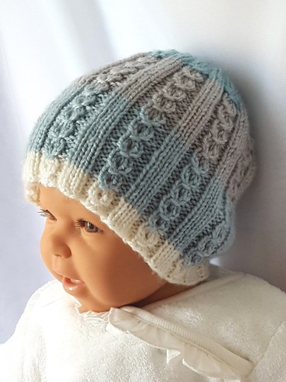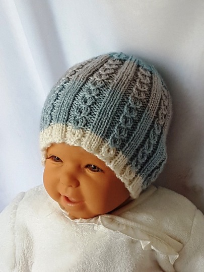 Absolut anfängertauglich ist diese Babymütze, da für das Muster keine weitere Hilfsnadel benötigt wird.