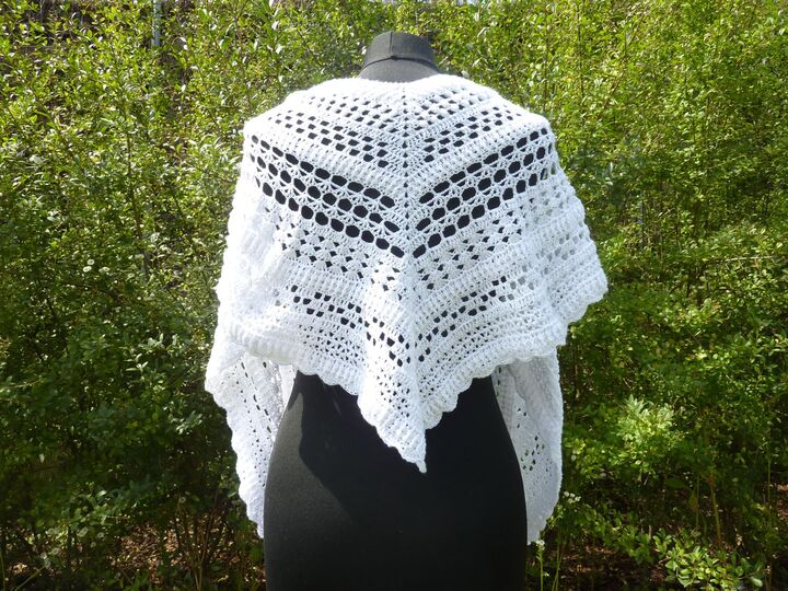 Unter Verwendung des angegebenen Materials wird der Schal 180 cm lang (am äußeren Rand gemessen) und ca. 30 cm breit.