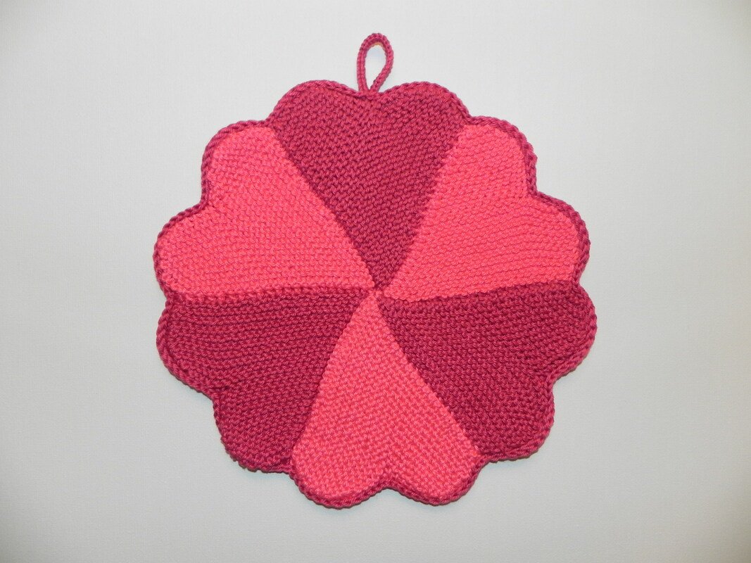 Dies ist eine Anleitung zur Herstellung eines gestrickten Topflappens in Herz-Waffel-Muster.