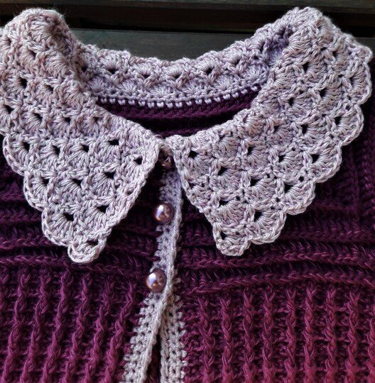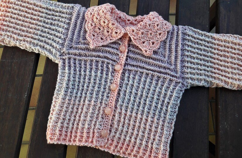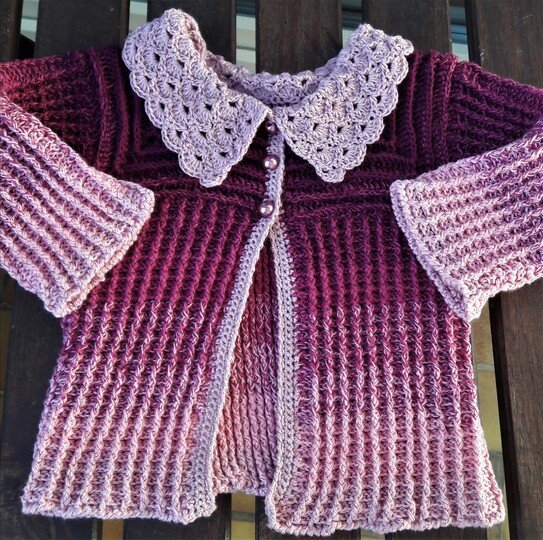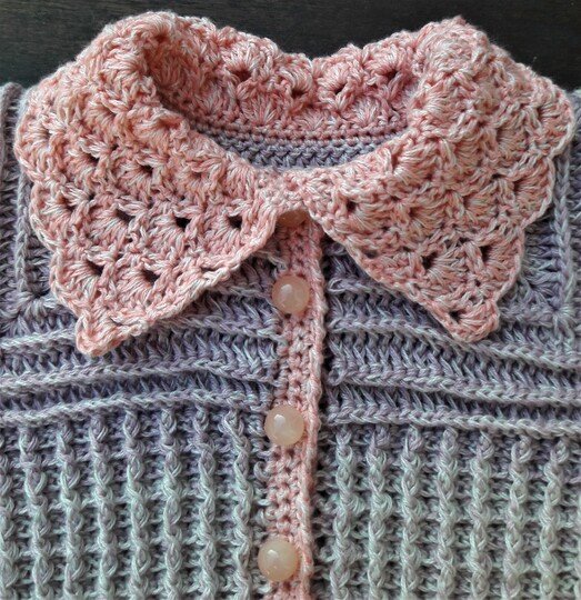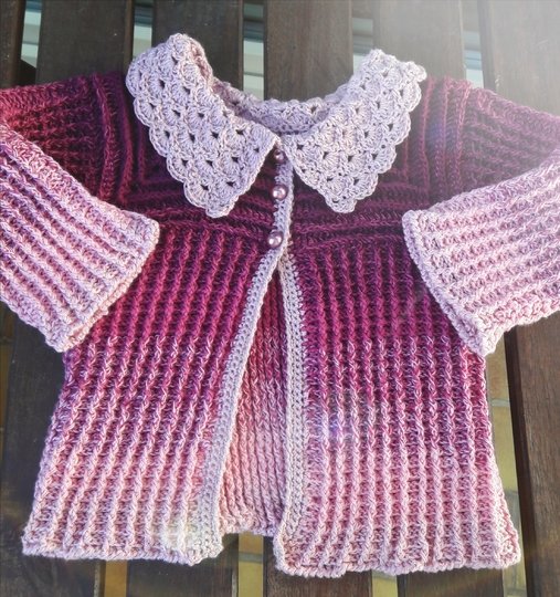 Hier erhältst du die Häkelanleitung für ein süßes Mädchen - Babyjäckchen. Es wird von oben nach unten gearbeitet und die Ärmel, Knopfleisten und der Kragen im Anschluss direkt angehäkelt, somit entstehen keine lästigen Nähte. Die Knopfleiste kannst du durchgehend arbeiten, oder nur im oberen Teil zum Knöpfen. Der Kragen ist ein echter Hinkucker und bildet einen schönen Kontrast zu den Strukturmustern.
