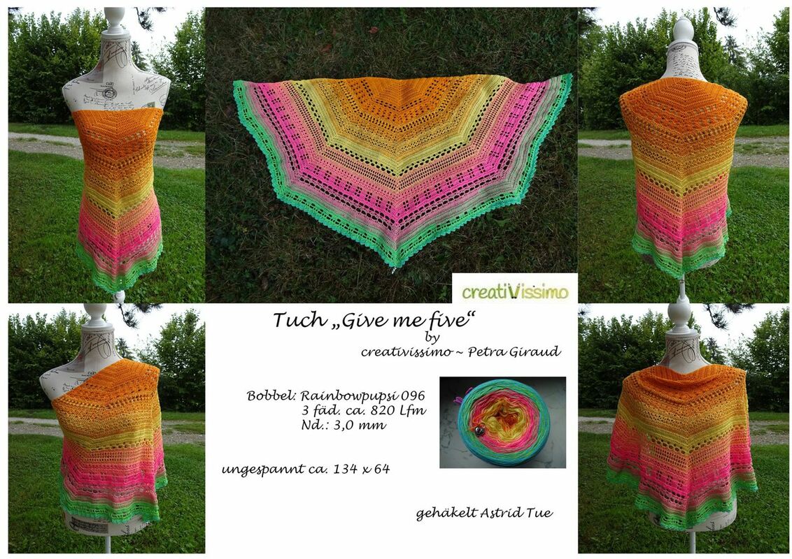 Das Tuch "Give me five" hat seinen Namen von den 5 Ecken, die durch entsprechende Zunahmen entstehen. Damit die einzelnen Muster auch entsprechend wirken, sind diese den Ecken angepasst.