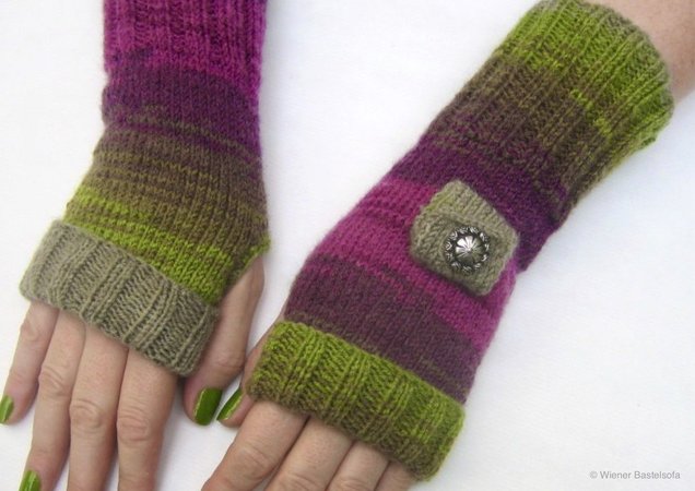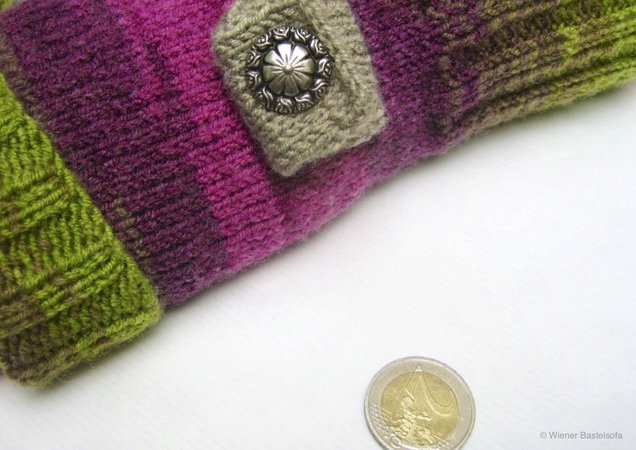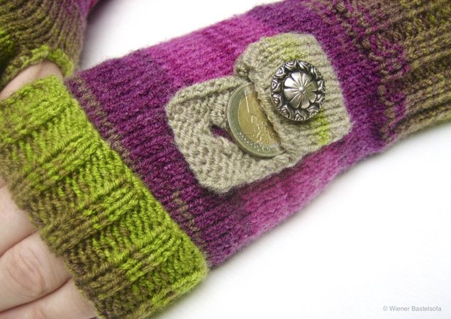Diese Stulpen wärmen nicht nur deine Hände, auf einer Stulpe befindet sich auch noch ein kleines Täschchen. So hast du immer schnell einen Einkaufschip oder eine Münze für die Parkuhr zur Hand und musst nicht in der Kälte in deiner Geldtasche danach suchen.