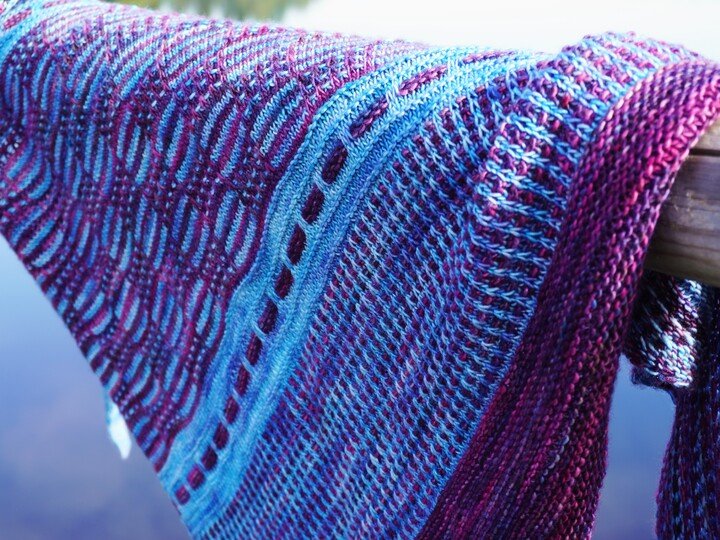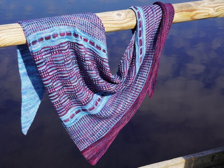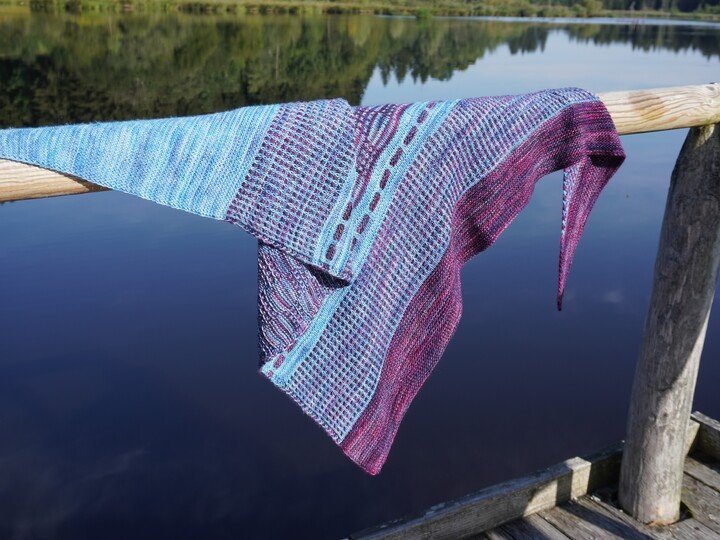 2 Farben und wechselnde Musterabschnitte aus kraus rechts gestrickten Maschen und Hebemaschen bilden das Grundgerüst für dieses Tuch. "HEBEMASCHEN - die beste Erfindung seit es 2-farbige Muster gibt!" Das Schöne daran ist, dass in jeder Reihe immer nur mit einer Farbe gestrickt werden muss – einfach stricken und entspannen!