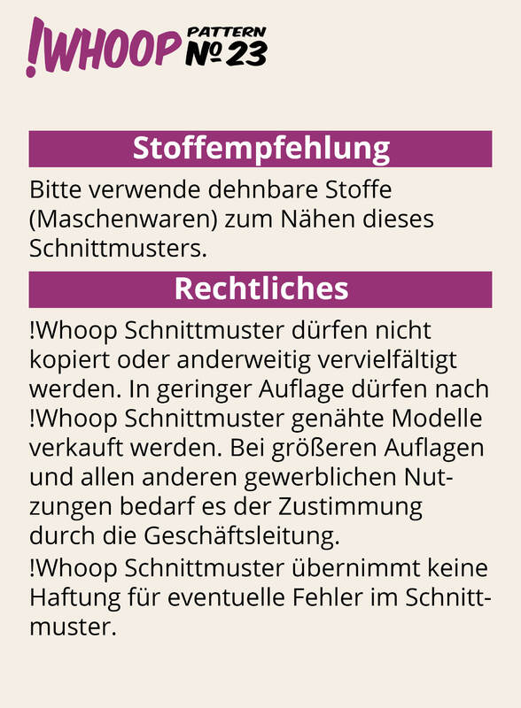 Nach !Whoop Schnittmustern genähte Modelle dürfen in geringer Auflage verkauft werden, bei großen Stückzahlen bedarf es der Zustimmung durch !Whoop patterns.