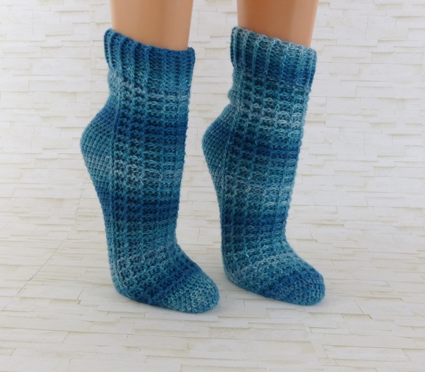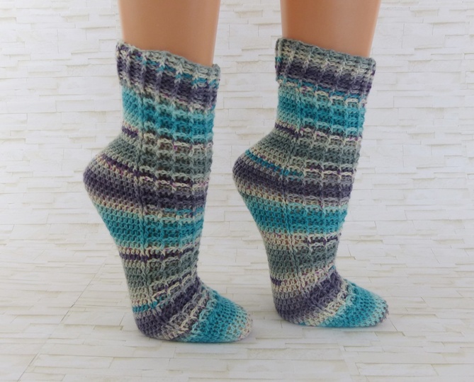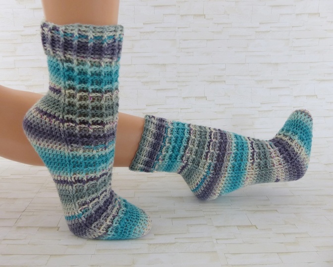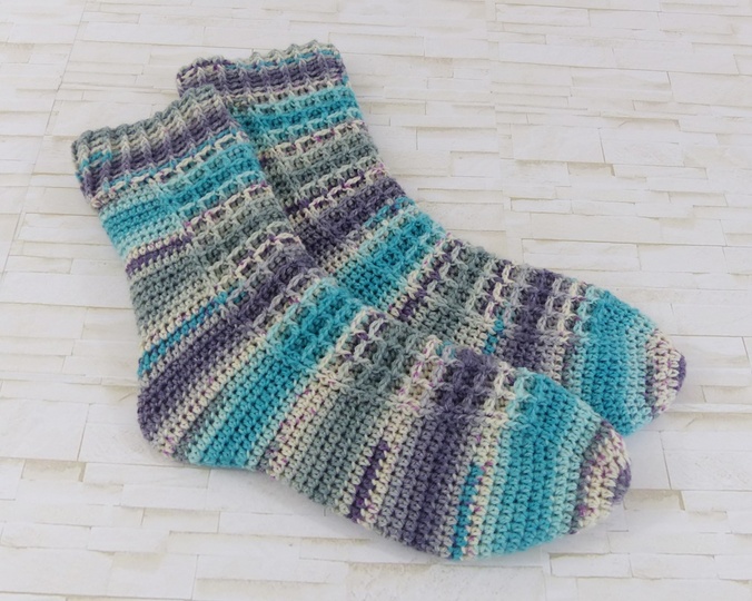 Easy-Soks°13 sind gehäkelte Socken (4-fach-Sockenwolle) ohne komplizierte Ferse - dafür mit schönen Waffelmuster.