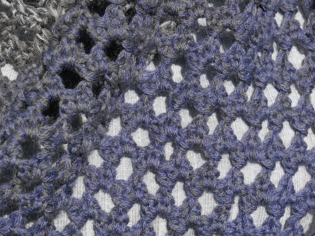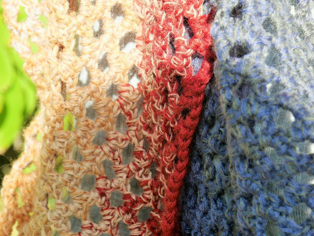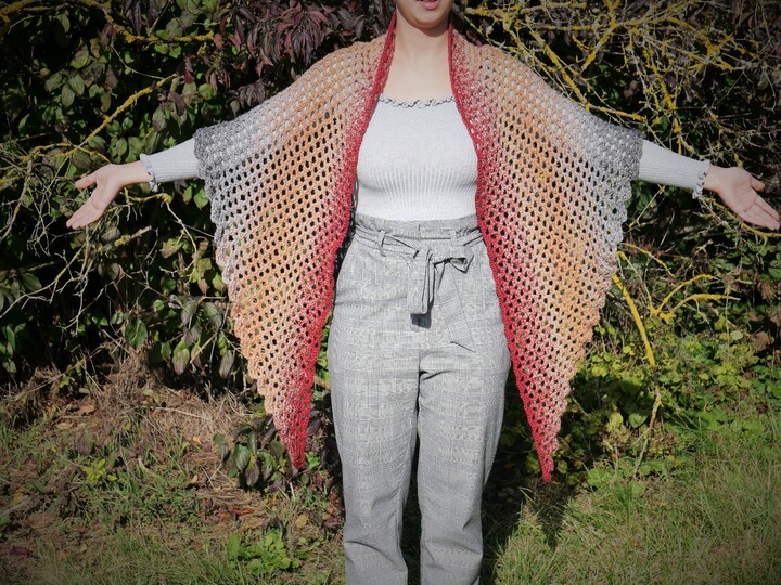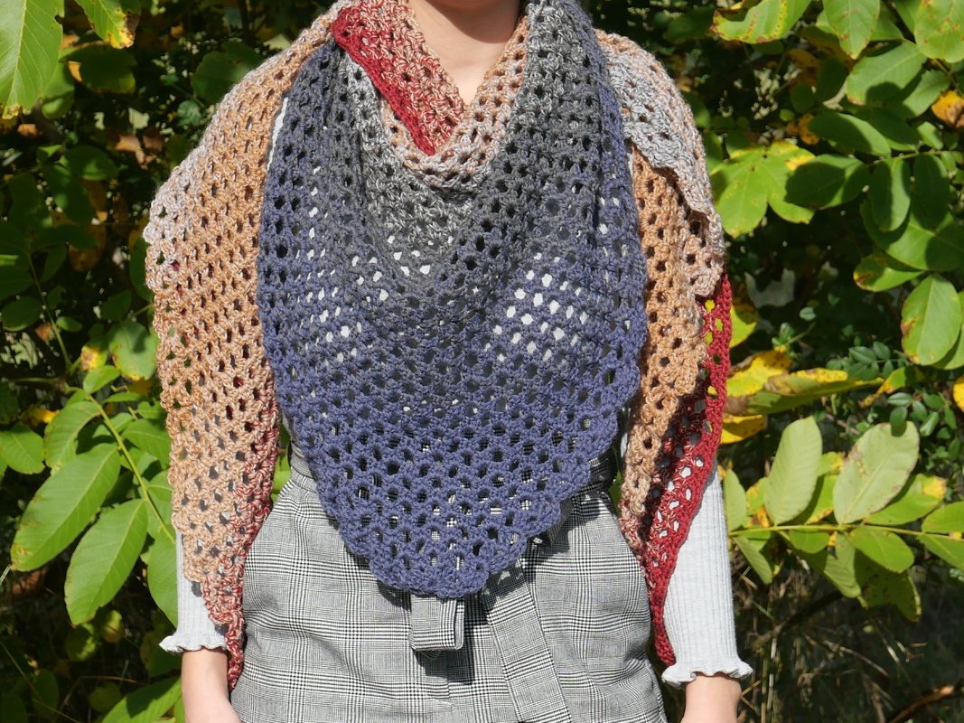 Das einfache Lochmuster macht das Tuch fluffig und leicht. Es fällt locker und trägt sich angenehm in vielen Varianten als Schultertuch oder Halstuch. Der Farbverlauf der von mir gewählten Wolle greift die Farben des Herbstes auf, passt aber auch wunderbar in den kommenden Winter.