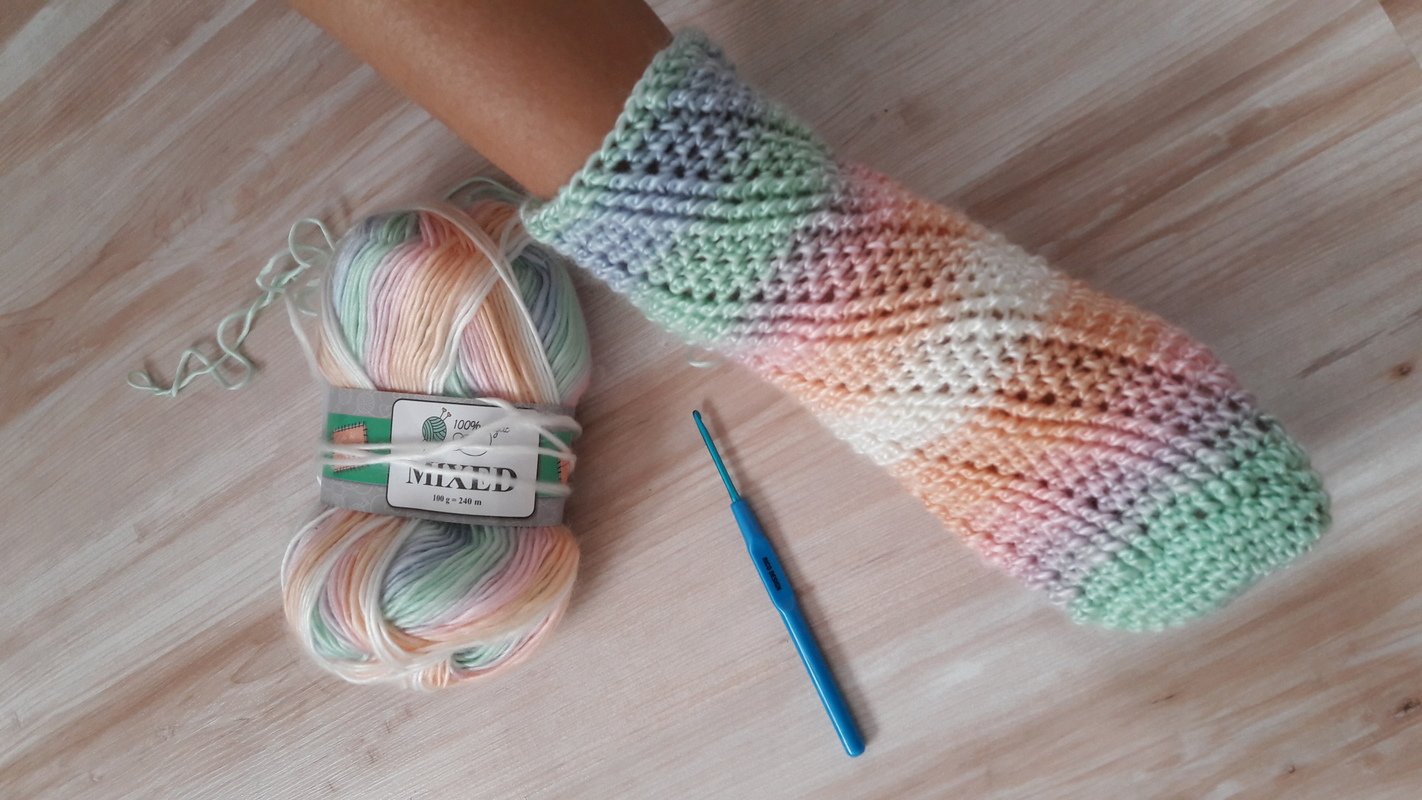 Mit dieser Anleitung kann man kuschelige Spiralsocken ohne Ferse häkeln. Ohne Ferse bedeutet man muss keine Größenangaben beachten.