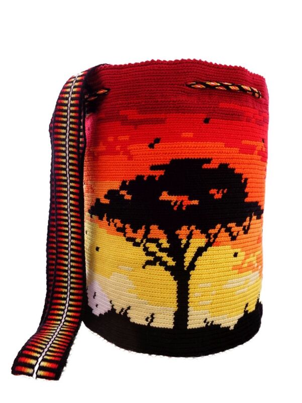 Die Mochila „Anki“ habe ich nach Fotos entworfen, die bei einem Afrika-Urlaub gemacht wurden. Mich hat das Motiv „afrikanische Burkeas/Elefanten/Sonnenuntergang“ so fasziniert, dass ich dachte, da müsste sich doch eine Mochila draus häkeln lassen. Dies hier ist das Ergebnis, das mich ziemlich viele Nerven gekostet hat, am Ende aber einfach wunderschön ist.