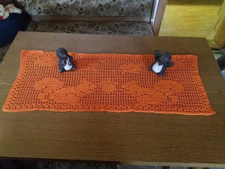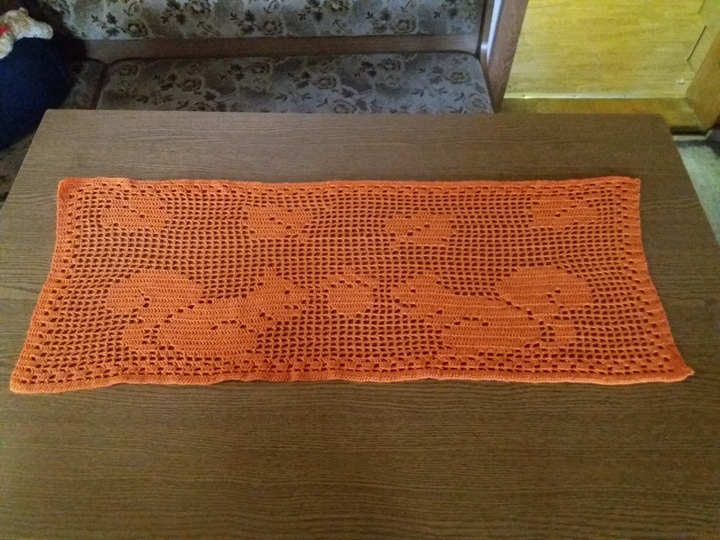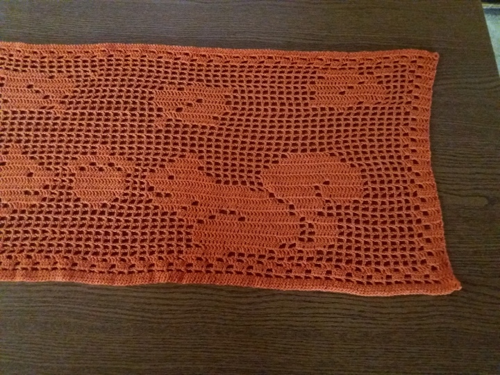 Der Tischläufer hat das Maß von ca.LxB 95 cm x 36 cm, dafür habe ich 2,5 Knäul a` 180m / 50g benötigt.