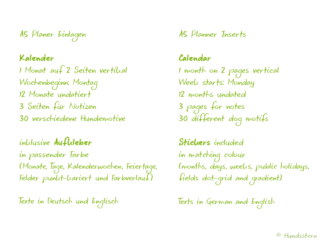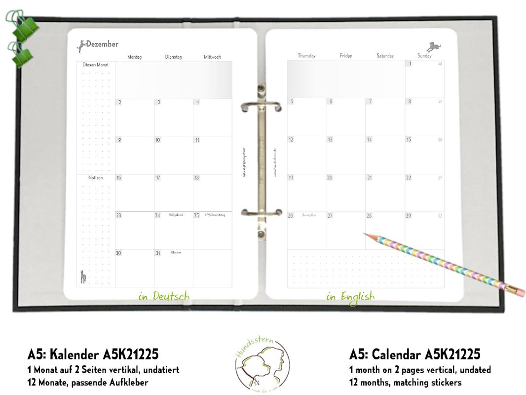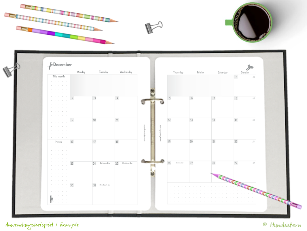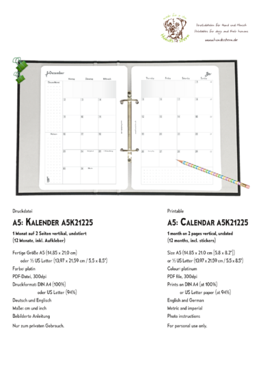 • keine gedruckten Lochmarken, daher für alle A5 Planer und Ringbücher verwendbar