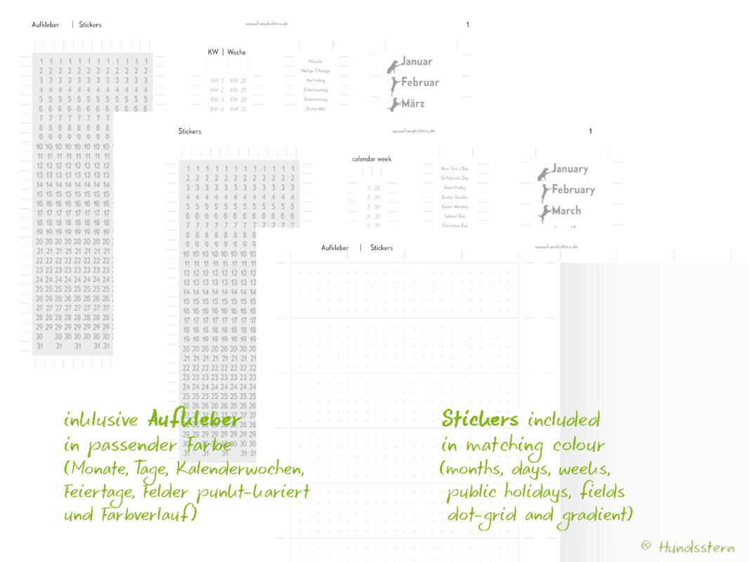 inklusive Aufkleber in passender Farbe (Monate, Tage, Kalenderwochen, Feiertage, Felder punkt-kariert und
