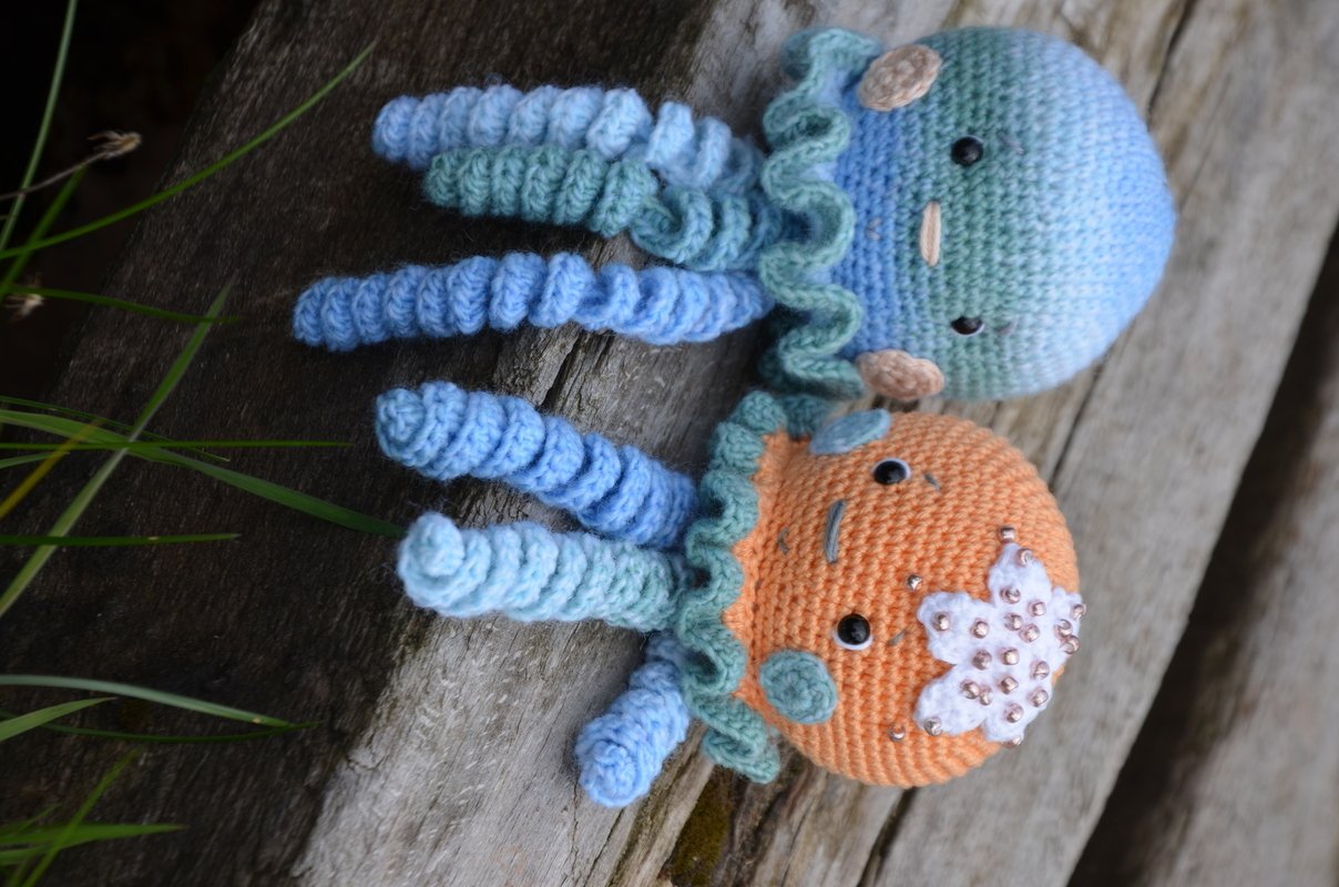 Du bekommst hier eine Anleitung für ein Quallenpärchen. Die Anleitung ist für Anfänger geeignet und eine Qualle ist relativ schnell nachgehäkelt. Sie kann aus Baumwollgarn für die ganz Kleinen gehäkelt werden oder aus flauschigem Garn für die Größeren... deiner Fantasie sind keine Grenzen gesetzt.