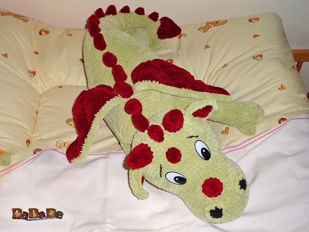 Mit Wolle der Nadelstärke 4 wird der Kuschel-Drache ungefähr; 80cm lang
