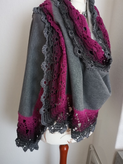 Eine wärmende Stola aus einem Materialmix, Sweatshirtstoff gepaart mit einem Bobbel.