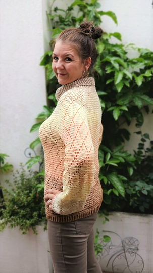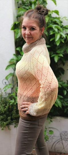 Dieser hübsche Rollkragenpulli ist ideal zum Verarbeiten von Farbverlaufsgarn geeignet, kann aber natürlich auch mit anderem Material gearbeitet werden.